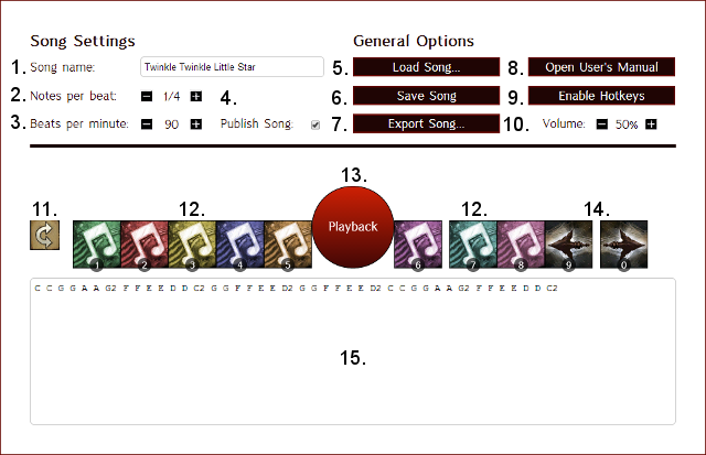 Creating a song is relatively simple once you know what all the buttons do. First, navigate to the corresponding page for the instrument you would like to compose for. There you can set up the song settings (song name, notes per beat, etc).